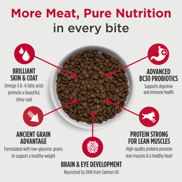 - Boosts Brain, Heart & Skin Health with Omegas - This ancient grain puppy food with DHA, taurine, and omegas -3 & -6 helps support cognitive development, heart health, and a shiny coat, fueling your puppy from the inside out.