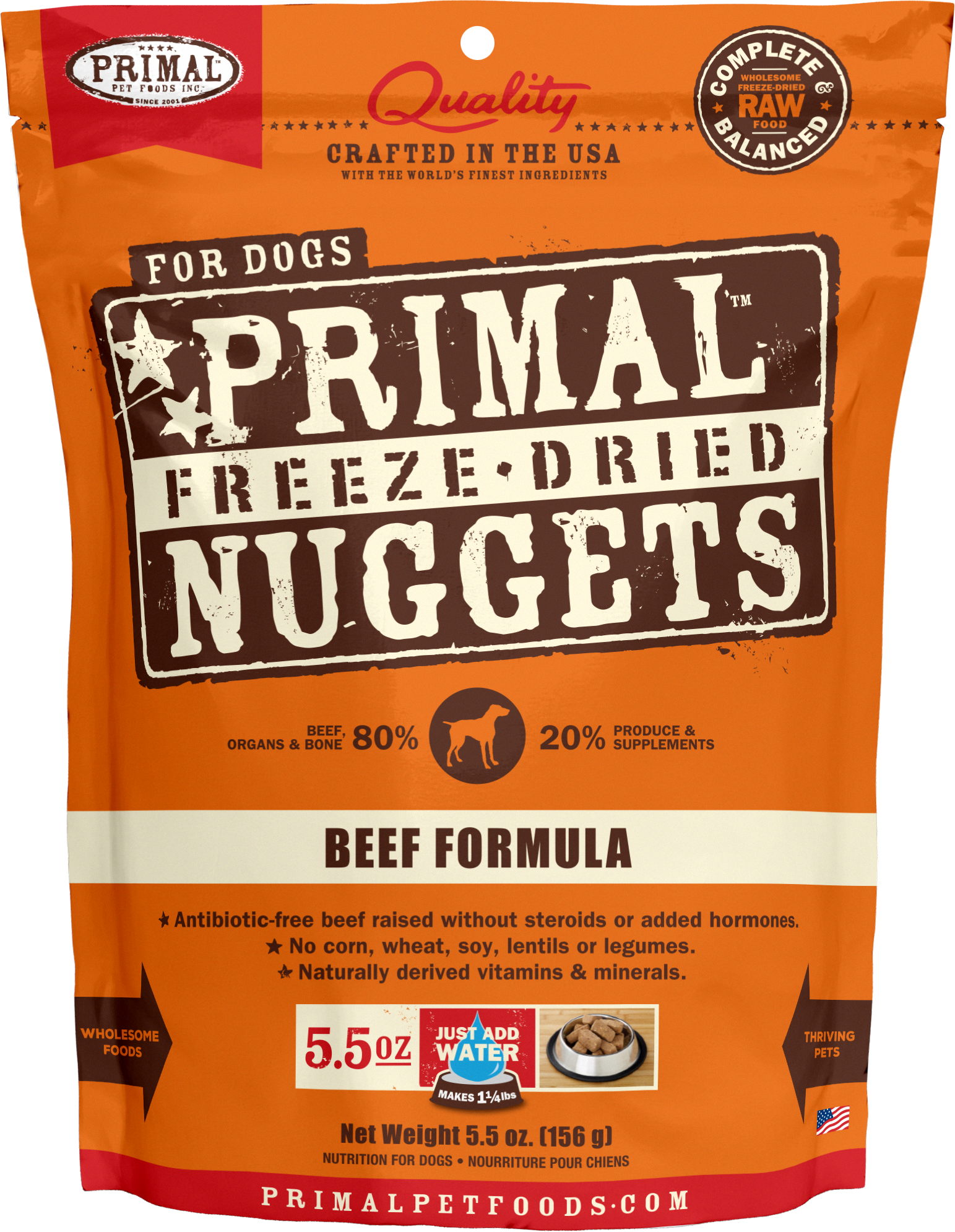 Primal Canine Beef Freeze-Dried Formula is Premium freeze-dried raw dog food made with grass-fed, antibiotic-free beef raised without steroids or added hormones and with USDA organic fruits and vegetables. Grain free. Serve as a complete & balanced meal, a freeze-dried dog food topper or treat.