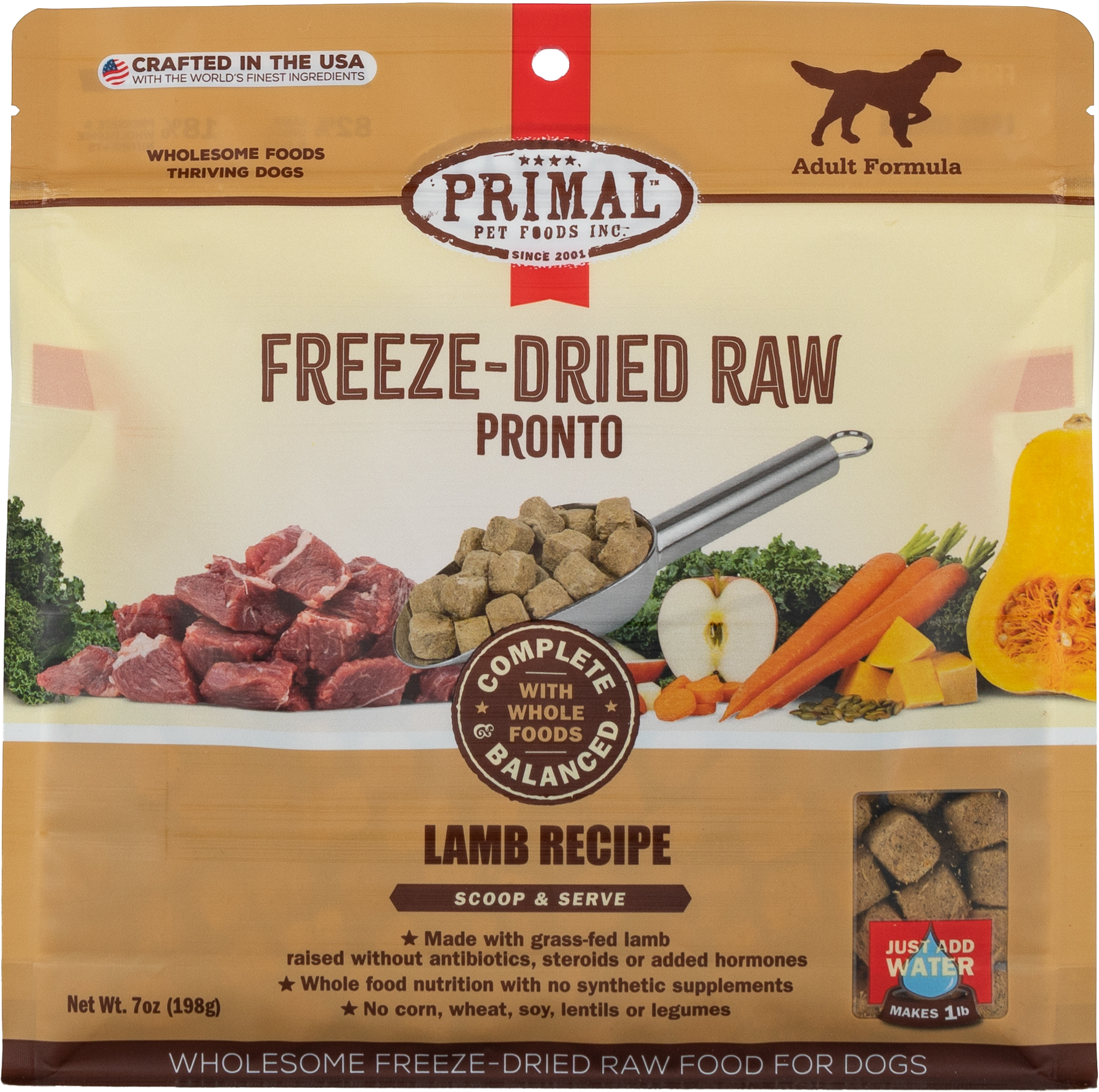 Primal Canine Lamb Pronto is a complete & balanced, safe raw diet. Available in Adult & Puppy formulas, specially crafted with high-quality proteins & certified organic produce for tailored, whole-food nutrition. Easy to use—just scoop, hydrate, and serve!