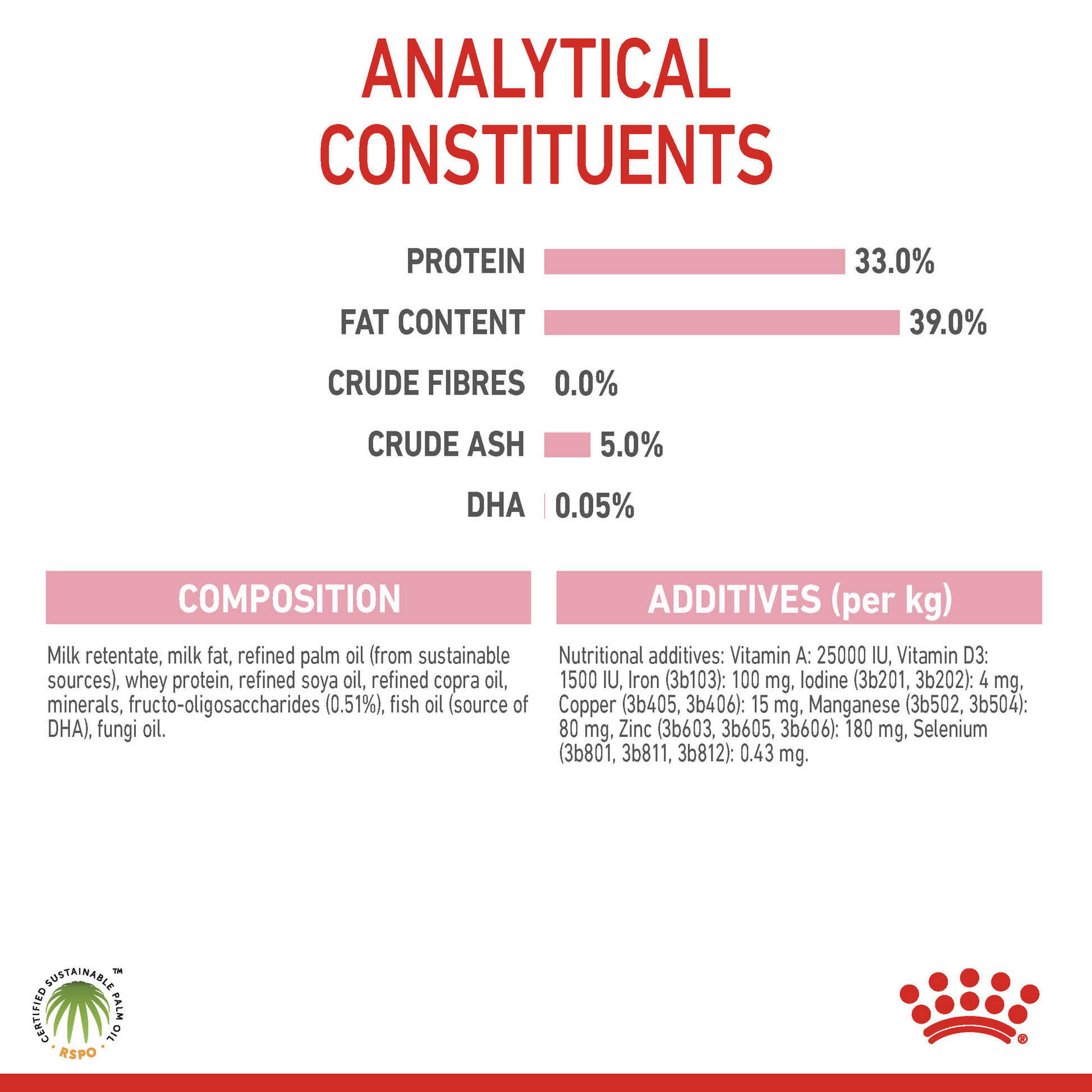 - For steady, harmonious growth, the composition of Baby Cat milk is as close as possible to queen's milk.