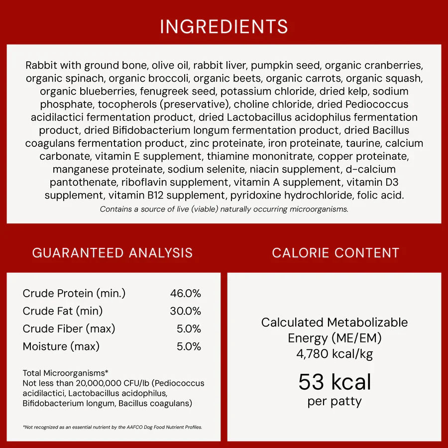 Rabbit with ground bone, olive oil, rabbit liver, pumpkin seed, organic cranberries, organic spinach, organic broccoli, organic beets, organic carrots, organic squash, organic blueberries, fenugreek seed, potassium chloride, dried kelp, sodium phosphate, tocopherols (preservative), choline chloride, dried pediococcus acidilactici fermentation product, dried lactobacillus acidophilus fermentation product, dried bifidobacterium longum fermentation product, dried bacillus coagulans fermentation product, zinc proteinate, iron proteinate, taurine, calcium carbonate, vitamin E supplement, thiamine mononitrate, copper proteinate, manganese proteinate, sodium selenite, niacin supplement, d-Calcium pantothenate, riboflavin supplement, vitamin A supplement, vitamin D3 supplement, vitamin B12 supplement, pyridoxine hydrochloride, folic acid.