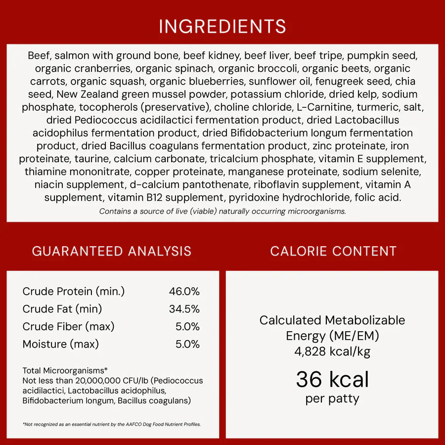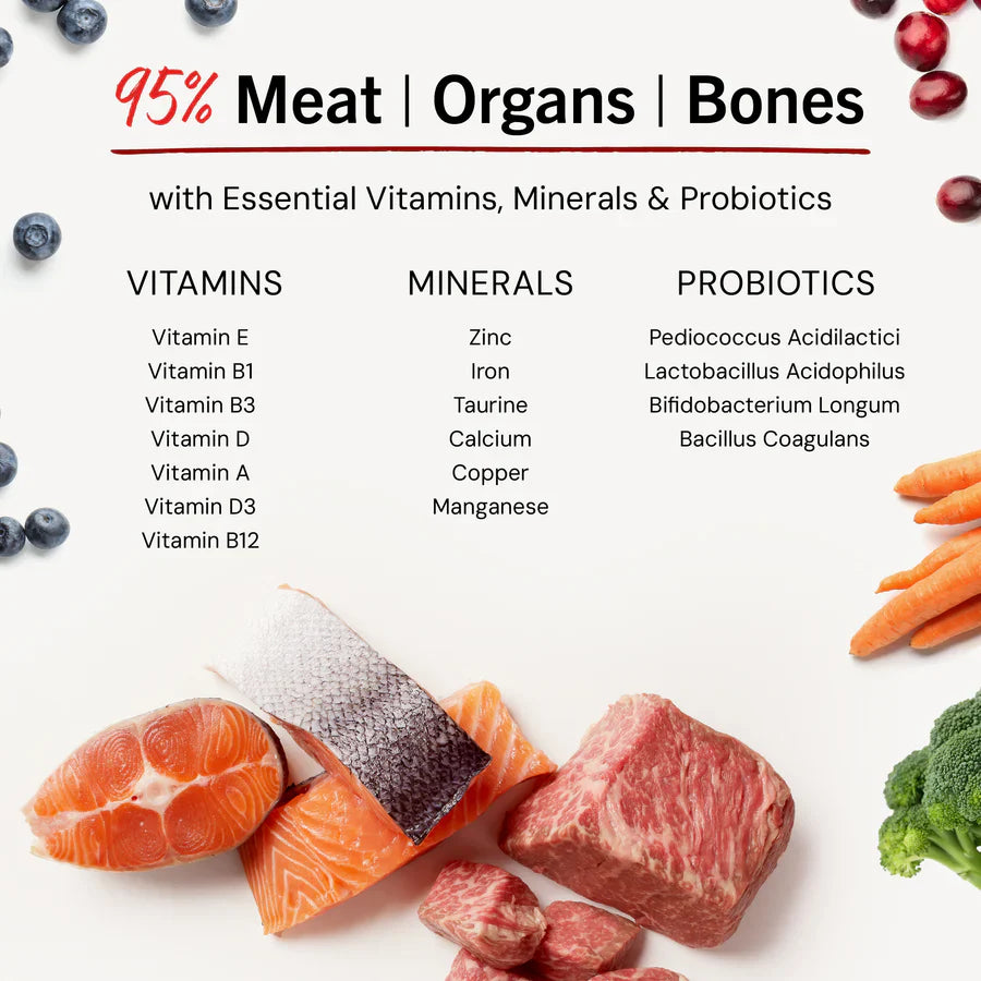 - 90-95% Meat, organ and bones - A true prey model diet