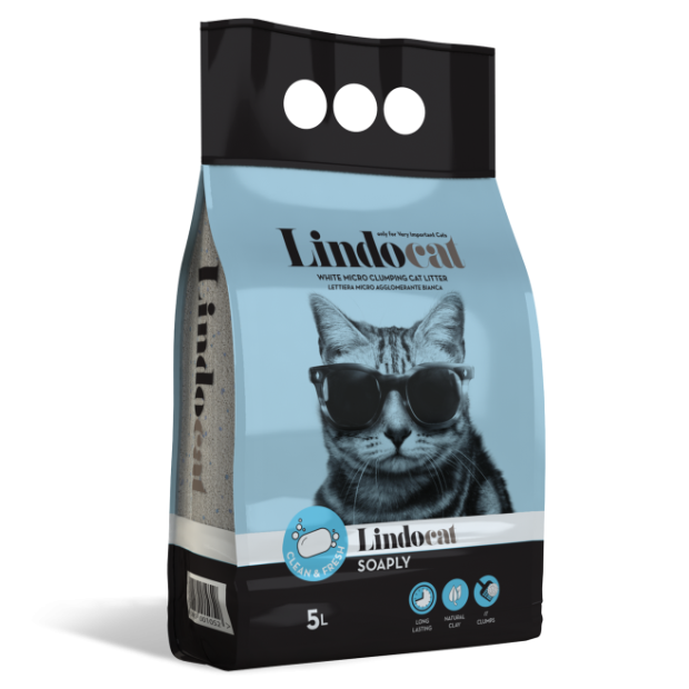 Lindocat Soaply is a high-quality hygienic clumping litter made entirely of excellent bentonite clay in fine white granules, enhanced by the presence of blue granules. The small-sized granules facilitate rapid clumping and the formation of solid lumps together with less product waste. Delicately scented with a selection of precious essences, Lindocat Soaply is the ideal litter for those who love a clean and fresh fragrance.